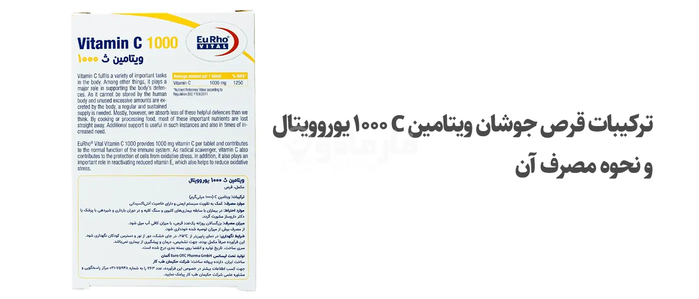 قرص جوشان ویتامین C 1000 برند یوروویتال در بستههای30 و 60 عددی عرضه میشود و هر قرص حاوی ۱۰۰۰ میلیگرم ویتامین C است.